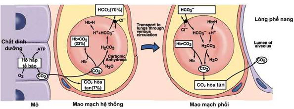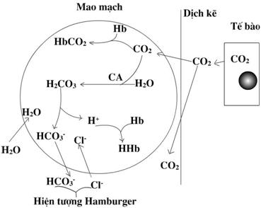 Tại mô, do chênh lệch phân áp, CO2 khuyếch tán từ dịch kẽ > huyết tương dưới dạng hoà tan > hồng cầu. Một phần kết hợp với Hb > HbCO2 , phần lớn kết hợp với H2O dưới tác dụng enzym CA > H+ + HCO3¯ . HCO3¯ khuyếch tán từ hồng cầu ra huyết tương kết hợp với protein và các muối kiềm.