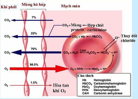 CO2 được vận chuyển theo ba cách: hòa tan trong huyết tương, gắn với Hb, dạng HCO3¯.